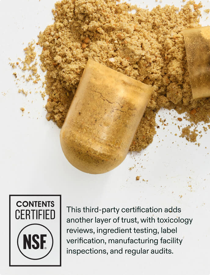 Every capsule is third-party tested and NSF Certified, ensuring purity, ingredient transparency, and the highest standards in manufacturing.